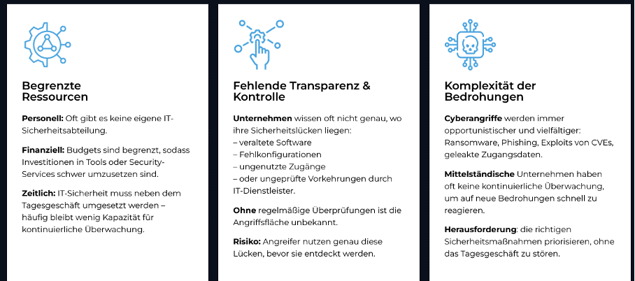 - Entscheidungsgrundlage für Management & IT: Strukturierte Reports mit konkreten Handlungsempfehlungen für technische Sicherheit sowie Business- und Compliance-Anforderungen.